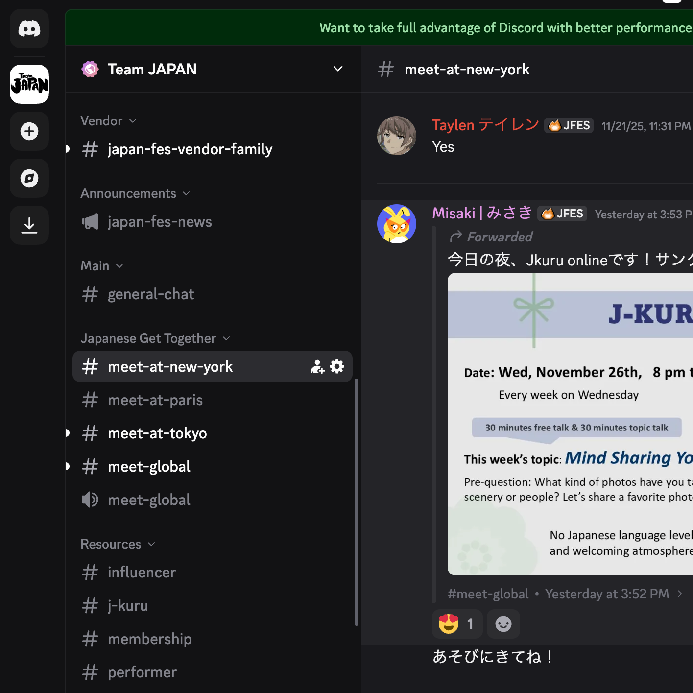 A global online hub where people who love Japan connect, share information, and meet through JAPAN Fes and J-KURU.